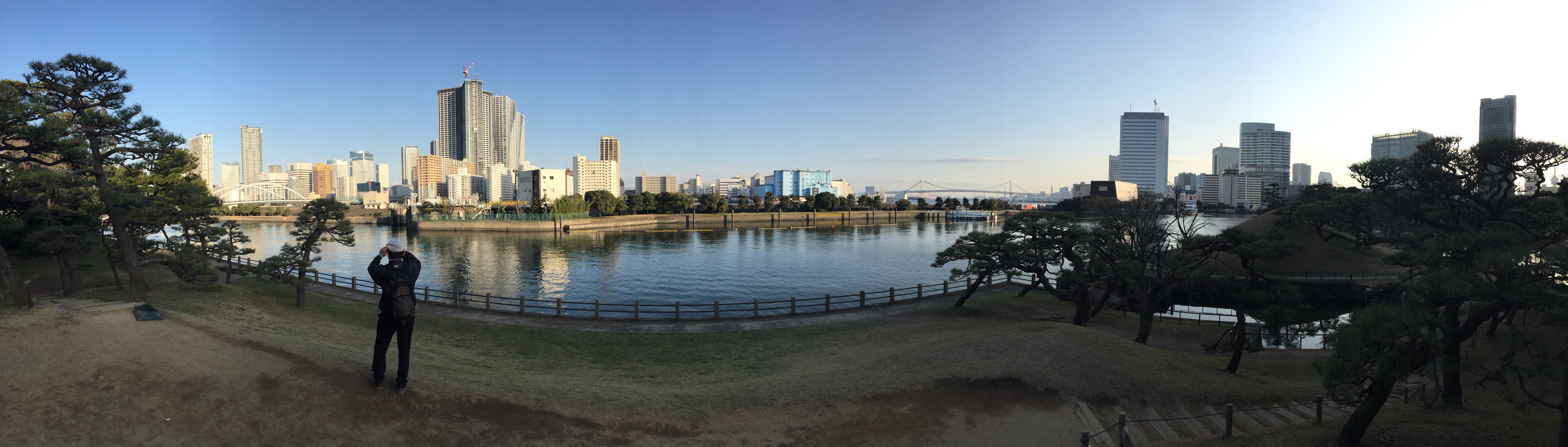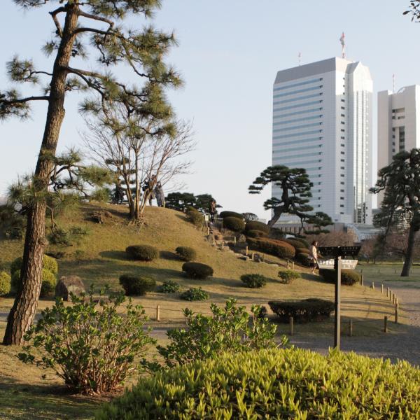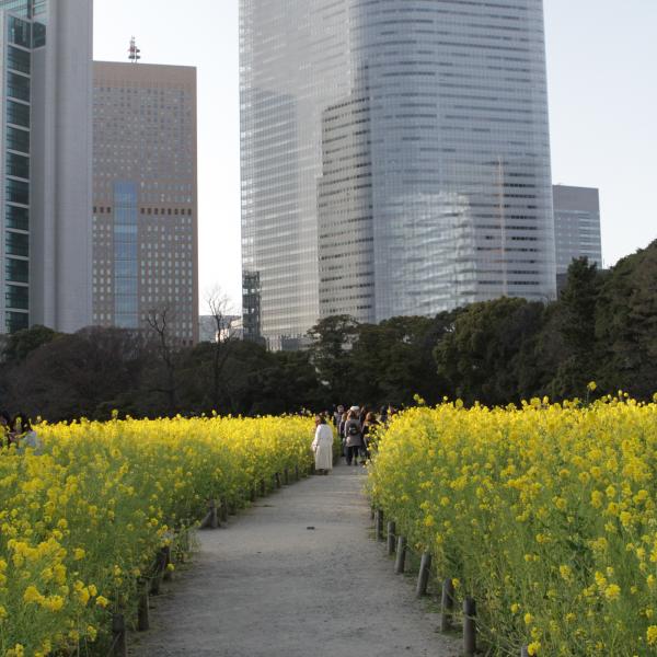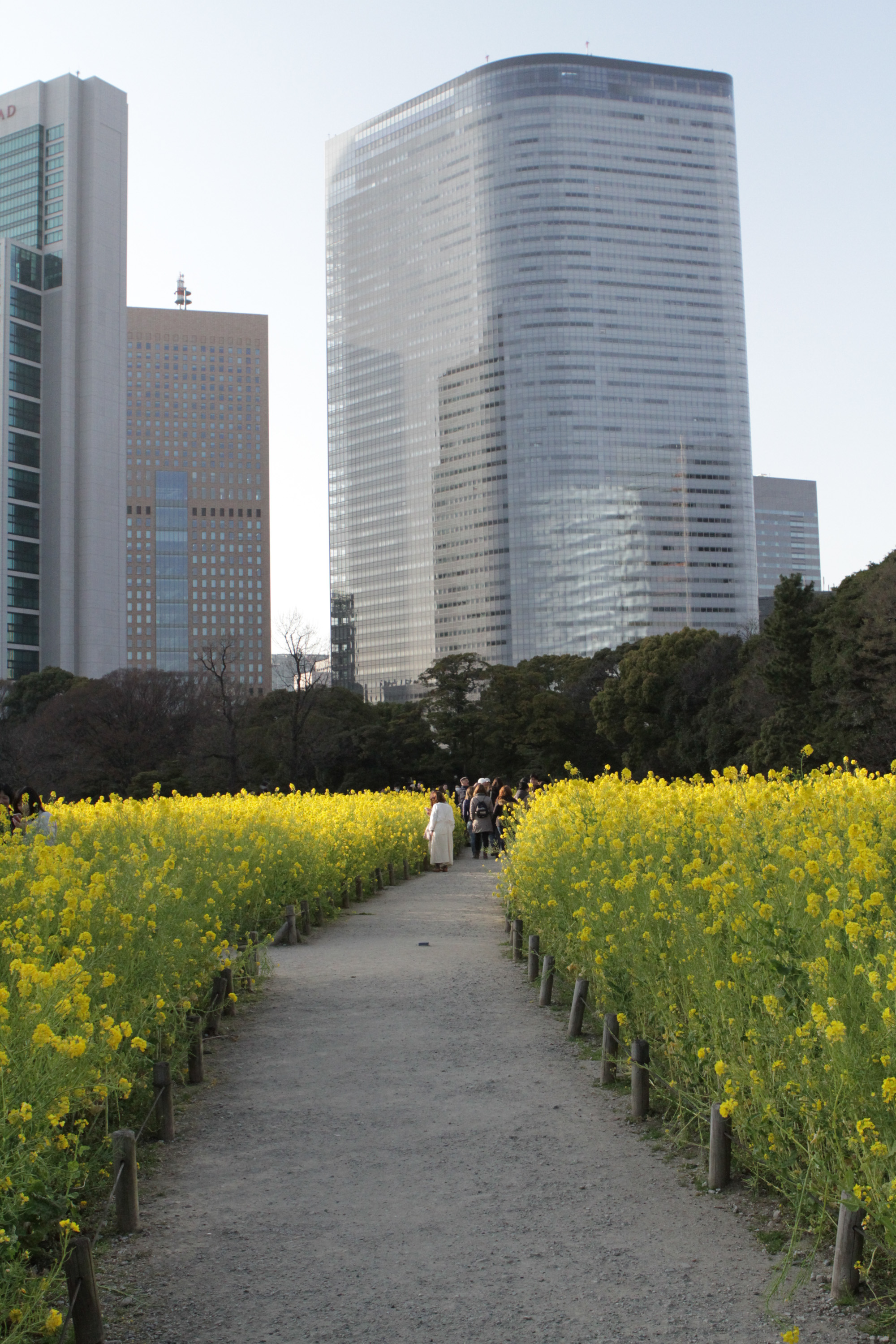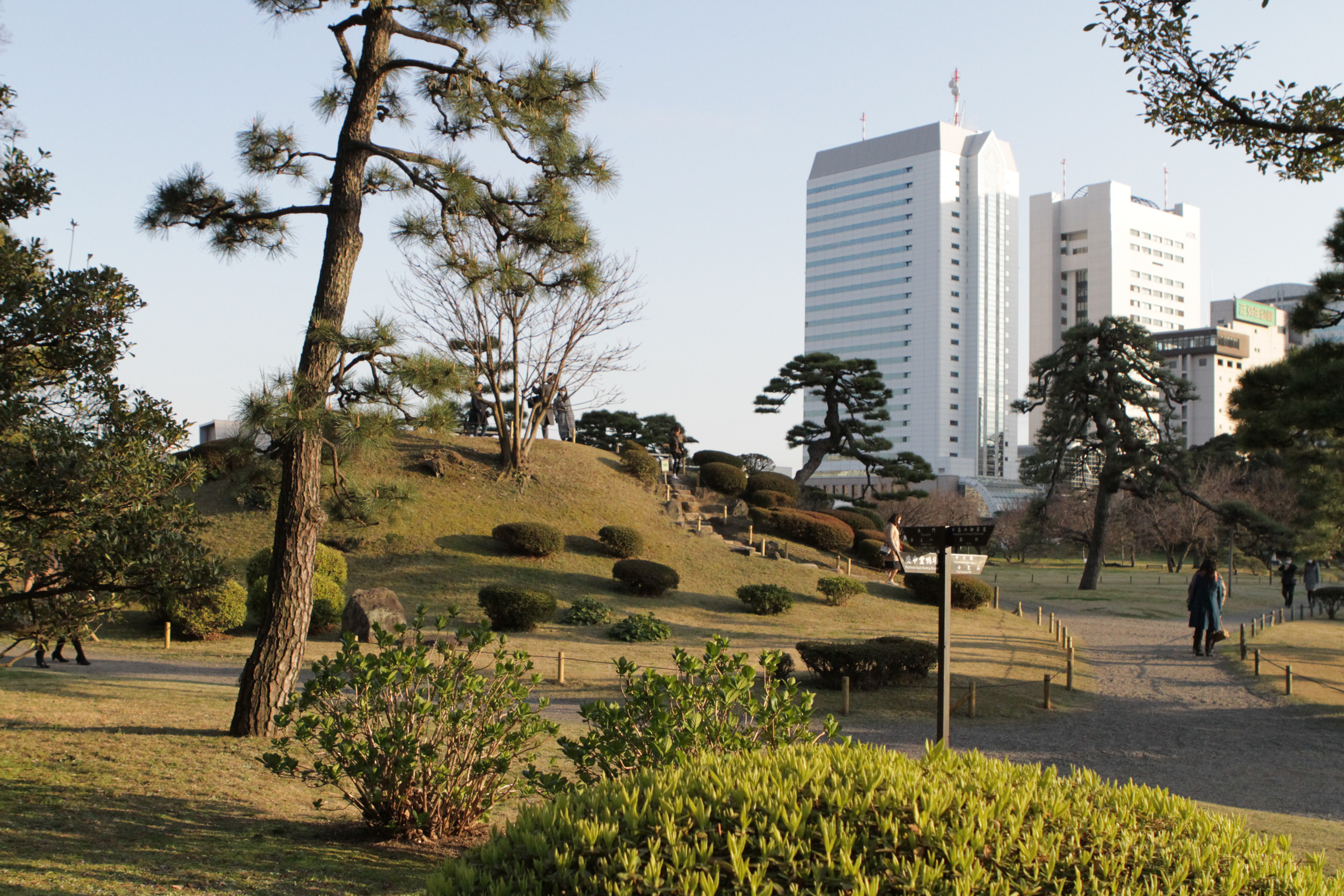 Poursuite de la promenade le long de la voie express jusqu’au jardin Hama-rikyû. Ses douves et l’un de ses étangs sont alimentés par l’eau de mer de la baie de Tokyo, à l’embouchure de la Sumida. Son autre particularité est certainement la richesse de sa végétation : plantations de pivoines et de colza, pin noir (l’un des plus anciens de Tokyo), pruniers en fleur, érables palmés, et quelques pins râblés typiques de la région. C’est un lieu en rupture totale avec la horde de gratte-ciels qui le borde.