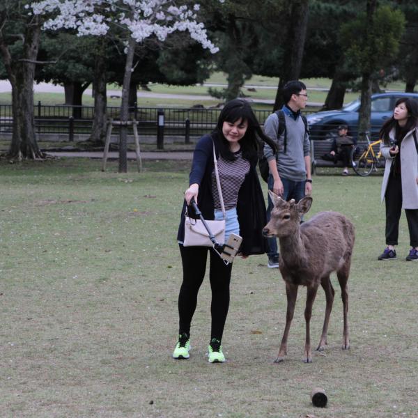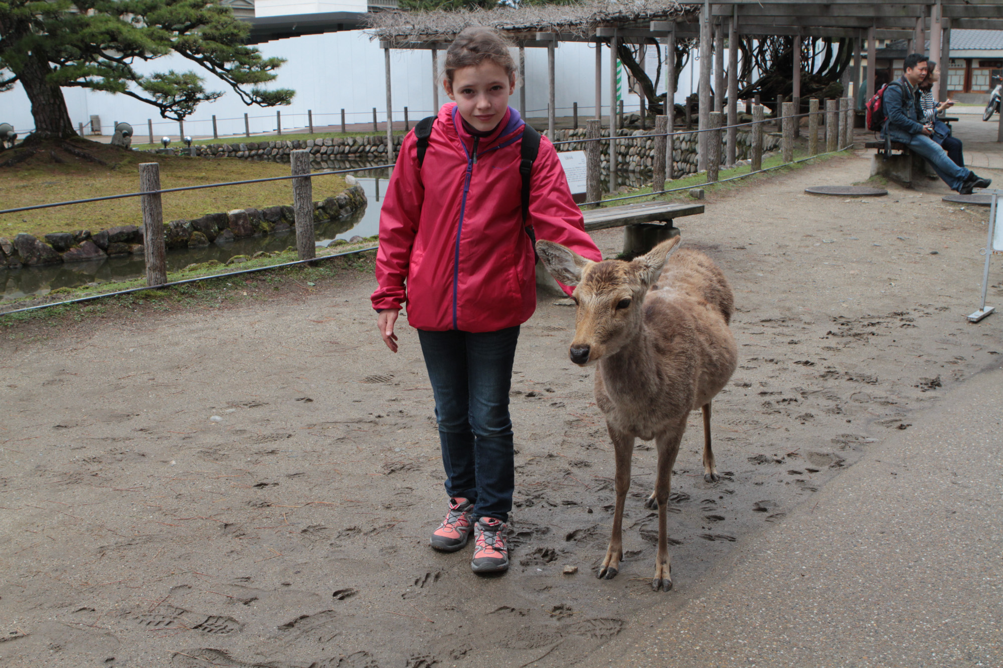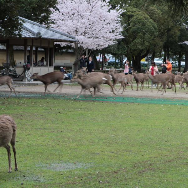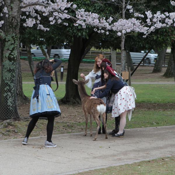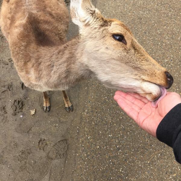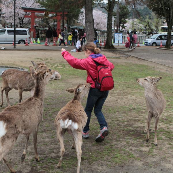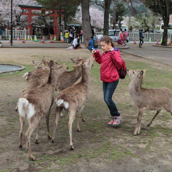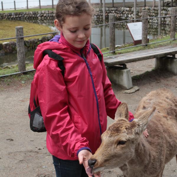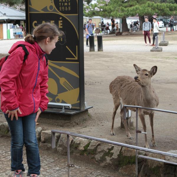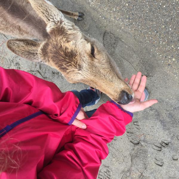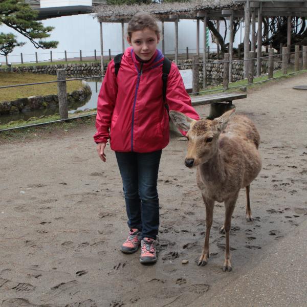 On est allé voir des cerfs shika, on les a caressés et on leur a donné à manger des galettes de riz. Ils m’ont arraché les paquets des mains et tiraient mes habits pour en avoir.